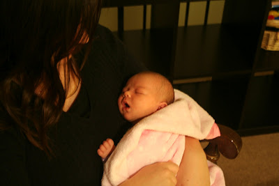 I can't even describe in accurate words what the next few moments were like. Tom, my Mom, and I welcomed our new baby girl into the world with many tears of joy! Her little body seemed so fragile as they laid her on my chest but her cry and movements proved she was a mighty little one. That moment is such an extraordinary one...to meet for the first time someone you have known and loved so fully for the last nine months. Let me just say I couldn't really contain myself. She stayed there on my chest for quite a while as things were "repaired" in certain places and as soon as I was ready to sit up she started breast feeding which she took to like a pro. It really is amazing to see a baby shortly after birth that was birthed naturally. They are so alert and strong it kind of takes your breath away.